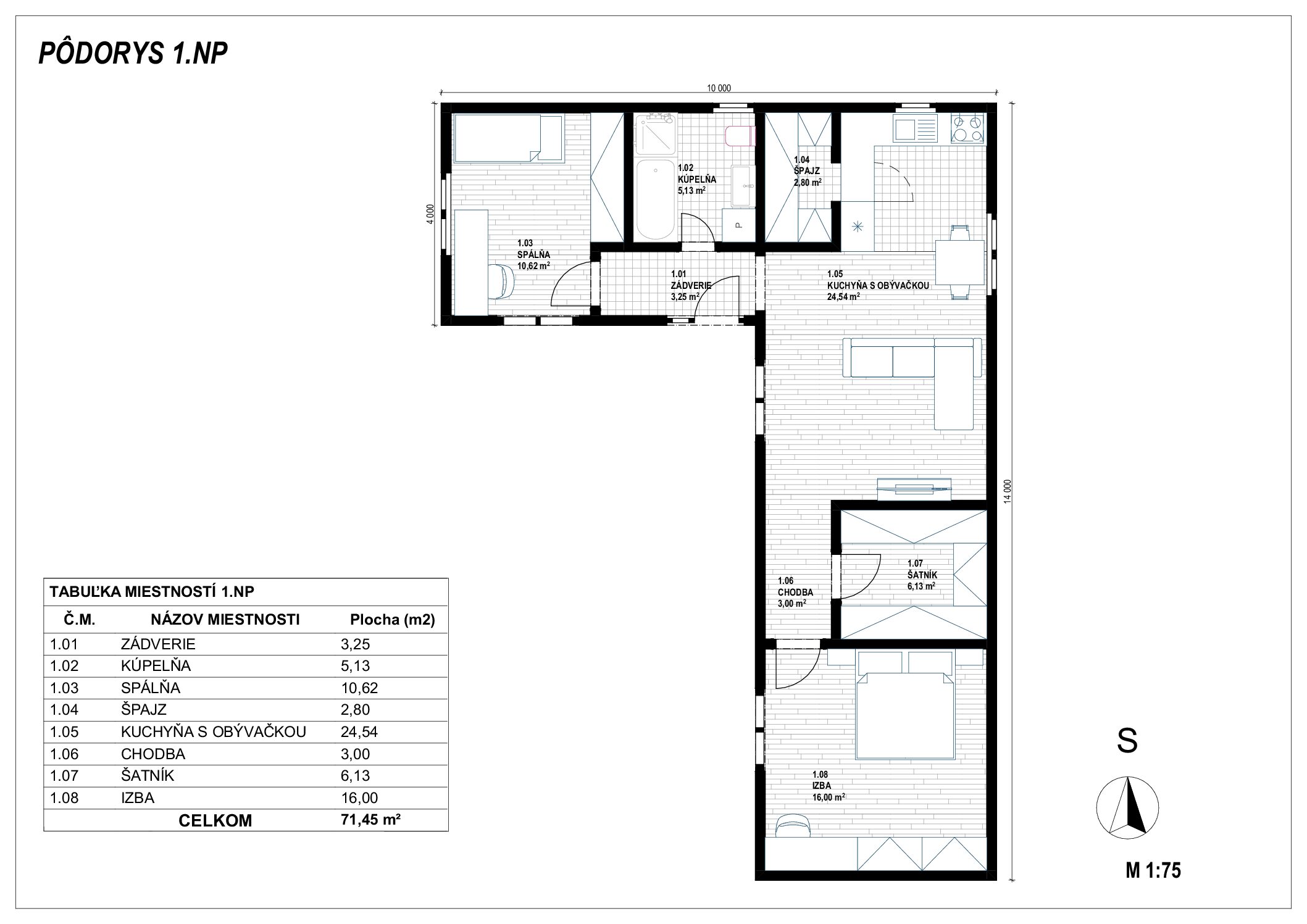 Prakticky riešený 3-izbový rodinný dom s celkovou úžitkovou plochou 71,45 m² ponúka prehľadnú a funkčnú dispozíciu. Dennú časť tvorí priestranná kuchyňa prepojená s obývacou izbou, zatiaľ čo nočná zóna zahŕňa spálňu, samostatnú izbu so šatníkom a kúpeľňu. Dispozíciu dopĺňa vstupné zádverie, chodba a praktický špajz, pričom celkové riešenie je možné flexibilne upraviť podľa individuálnych požiadaviek zákazníka.