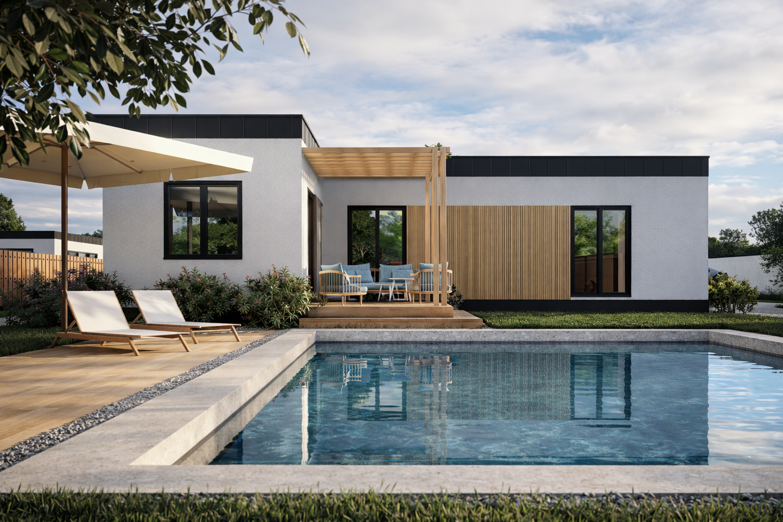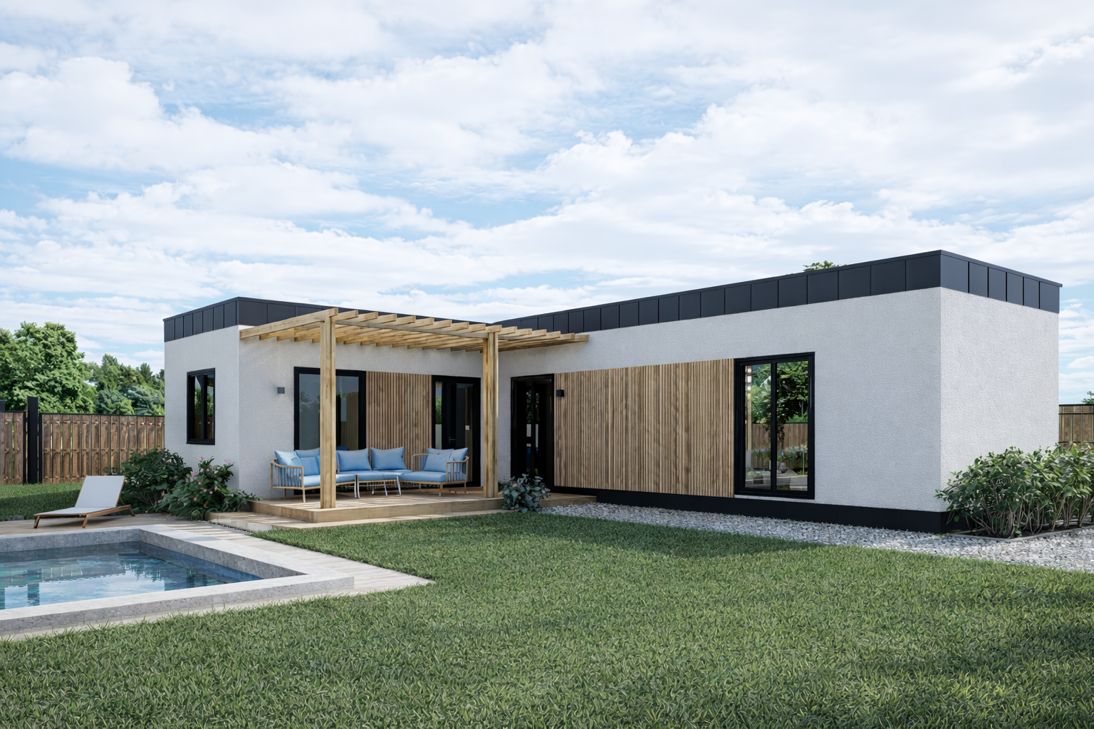 Kompaktný a premyslene navrhnutý modulový dom v tvare L, ktorý prináša ideálnu rovnováhu medzi priestorom, cenou a komfortom bývania. Je navrhnutý tak, aby maximálne využil každý meter štvorcový a zároveň vytváral príjemné, funkčné a harmonické prostredie pre každodenný život.