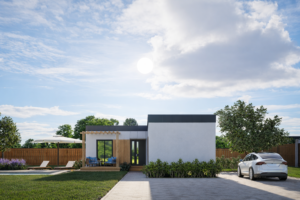 Komfortný a atraktívny modul s úžitkovou plochou 85 m² pre tých, ktorí požadujú viac priestoru a vyšší štandard bývania. Obsahuje dve detské izby, spálňu, obývačku s kuchyňou a dostatok úložného priestoru. Tvar domu prirodzene umožňuje realizáciu zastrešenej vstupnej terasy aj zadnej terasy, čím sa naplno využíva potenciál celej stavby.