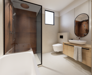 hotová kúpeľňa so sanitou (sprchový kút, wc, umývadlo) (kúpeľňu vieme dodať aj bez sanity alebo ju prispôsobiť individuálnym požiadavkám zákazníka)