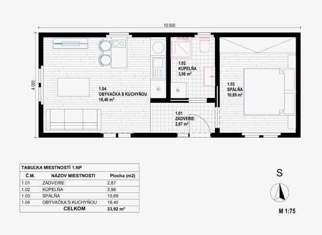 • 34 m² – kompaktné riešenie vhodné ako štartovacie alebo rekreačné bývanie
