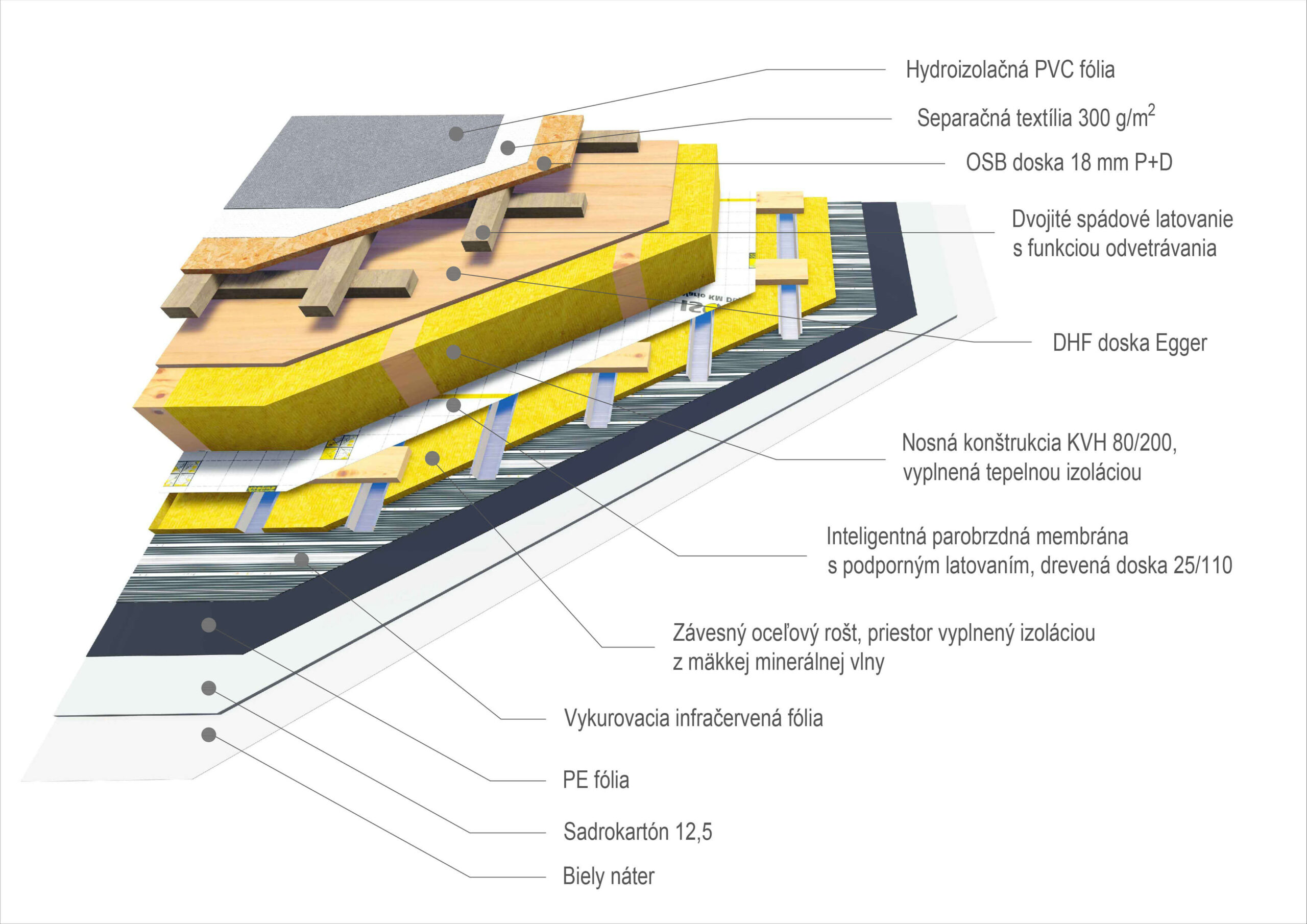 strecha - PVC fólia s okrajovým poplastovaným oplechovaním; odvodňovací systém